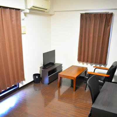 ・8帖の洋室には、セミダブルベッド、ソファ、デスク&チェア、32型液晶テレビを設置しました。