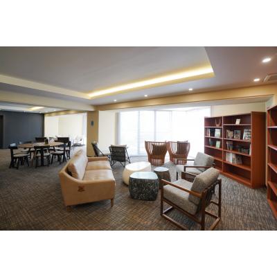 宿泊者(入居者)専用ラウンジはとても広く、 サンルームのように日当たりのいい窓辺が。 個室ブースもあります。 本棚には雑誌やコミックス、仙台を紹介する本、 そのほかジャンルを取り揃えています。