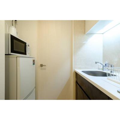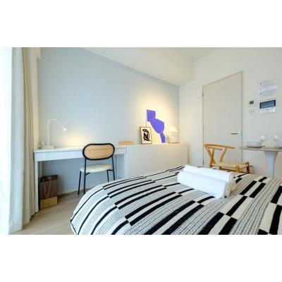 ベッドはダブルサイズなのでお二人での宿泊も◎ そして基本的な家電や調理器具、アメニティが ひと通り揃っているので、長期滞在にピッタリ!