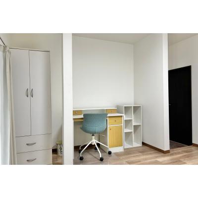 お次はお部屋へ。 それぞれ個室があるので、 プライベート時間もしっかり確保◎ お部屋によって家具は多少変わりますが、 ベッド、デスク、収納、冷蔵庫付き。 身軽に、すぐ生活をスタートできますね。