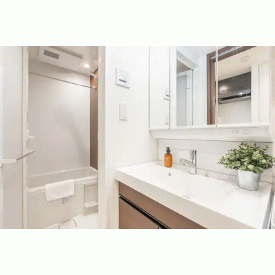 3面鏡の洗面台には、 整然と並ぶケア用品。 バスタブに浸かる夜は、 デジタルのざわめきを忘れる時間。