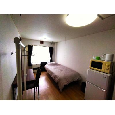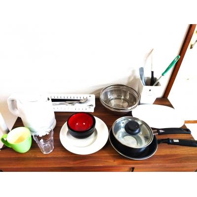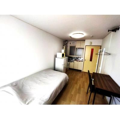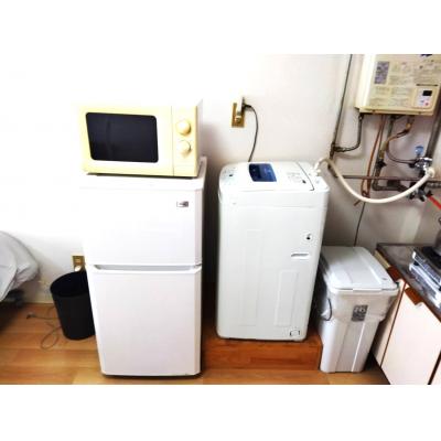 テレビ、ドライヤー、洗濯機、電気ポット、電子レンジ、冷蔵庫 、イス、カーテン付き、シーツ類、ソファー、テーブル、ベッド、寝具一式 、お玉、まな板、ガスコンロ、スポンジ、フライパン、食器類、鍋、片手鍋、包丁 、シャワー 、ゴミ箱、スリッパ、ハンガー、室内物干し 、ガス、トイレ、下水道、給湯設備 、洗濯機置場(室内)、暖房完備