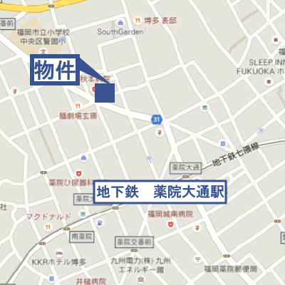 福岡市地下鉄空港線天神駅 徒歩16分 西鉄天神大牟田線薬院駅 徒歩8分 西鉄天神大牟田線西鉄福岡(天神)駅 徒歩12分 |