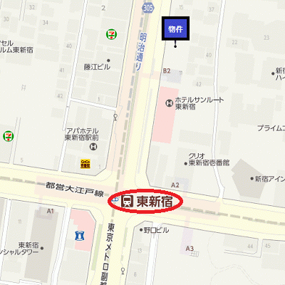 東京メトロ副都心線東新宿駅 徒歩1分 都営大江戸線東新宿駅 徒歩1分 都営新宿線新宿三丁目駅 徒歩7分 |