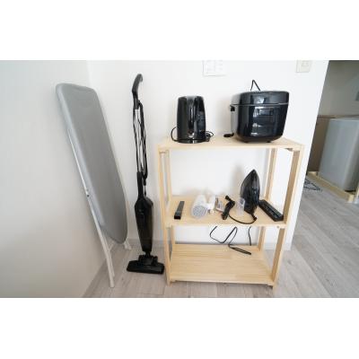 アイロン、アイロン台、エアコン、テレビ、ドライヤー、炊飯ジャー、洗濯機、掃除機、電気スタンド、電気ポット、電子レンジ、冷蔵庫 、イス、カーテン付き、シーツ類、ソファー、テーブル、テレビ台、デスク、ベッド、食器棚、寝具一式 、IHクッキングヒーター、お玉、まな板、キッチン洗剤、スポンジ、スポンジ入れ、フライパン、フライ返し、蓋付鍋、食器類、片手鍋、包丁 、トイレットペーパー、シャワー、タオル、トイレ洗剤、トイレ用ブラシ、バスマット、バス洗剤、風呂用スポンジ 、ゴミ箱、スリッパ、ティッシュ、ハンガー、鏡、洗剤、物干し竿 、ガス、トイレ、下水道、給湯設備、上水道、分譲タイプ、浴室 、エレベーター、オートロック、宅配BOX 、インターネット対応(無料)、フローリング、洗濯機置場(室内)、冷暖房完備